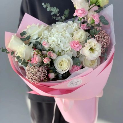 Букет из гортензии, хризантемы, гвоздики, оксипеталума и роз в стильной упаковке “Ласковый ветерок”