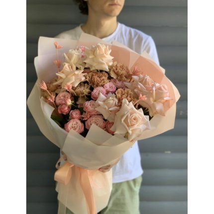 Шляпная коробка гортензией, пионами, эустомой, тюльпанами, гиацинтами, фрезией и гвоздикой “Джоанна”