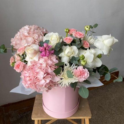 Шляпная коробка с розами, гвоздикой, гипсофилой и антуриумом “Kenzo box”