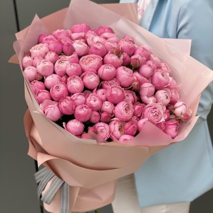 Цветы в большой коробке: садовые розы, лизиантус, маттиола, тюльпаны