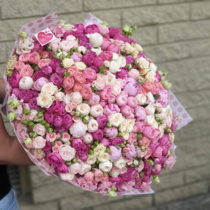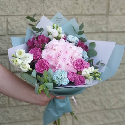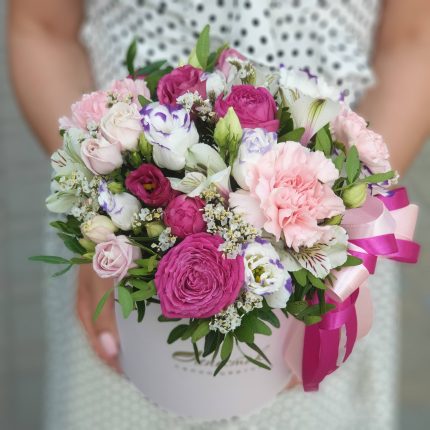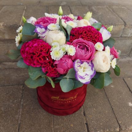 Бархатный цилиндр из голубых диантусов, розовых пионов и ароматной маттиолы