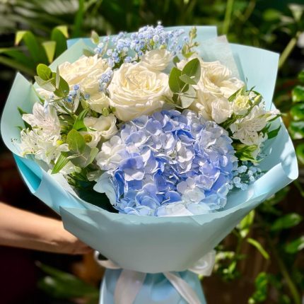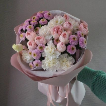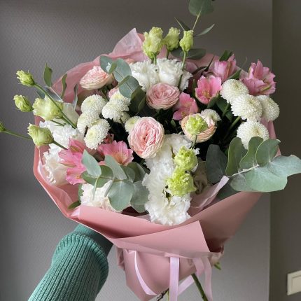 Авторский букет “Душистый горошек” с белой лилией, хлопком и лизиантусом