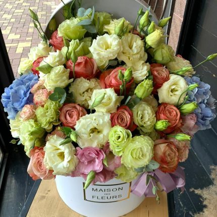 Бархатный цилиндр из голубых диантусов, розовых пионов и ароматной маттиолы