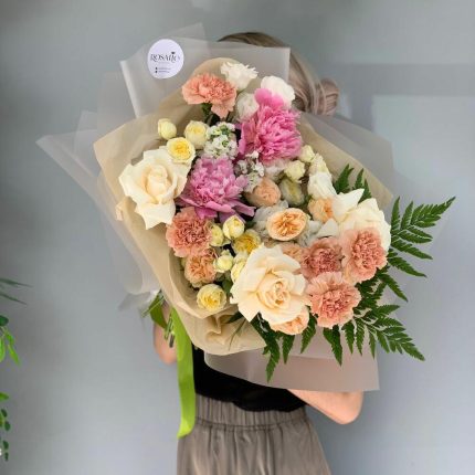 Бархатный цилиндр из голубых диантусов, розовых пионов и ароматной маттиолы
