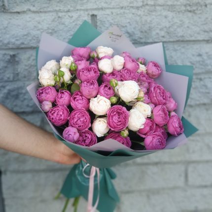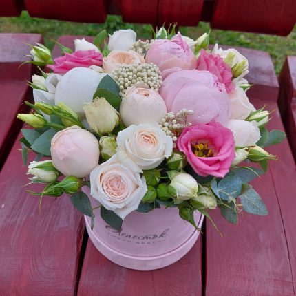 Бархатный цилиндр из голубых диантусов, розовых пионов и ароматной маттиолы