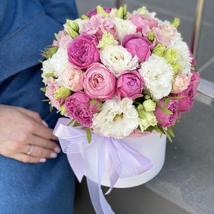 Коробка Тоскана из эустомы, кустовых и одноголовых роз, диантуса и альстромерии