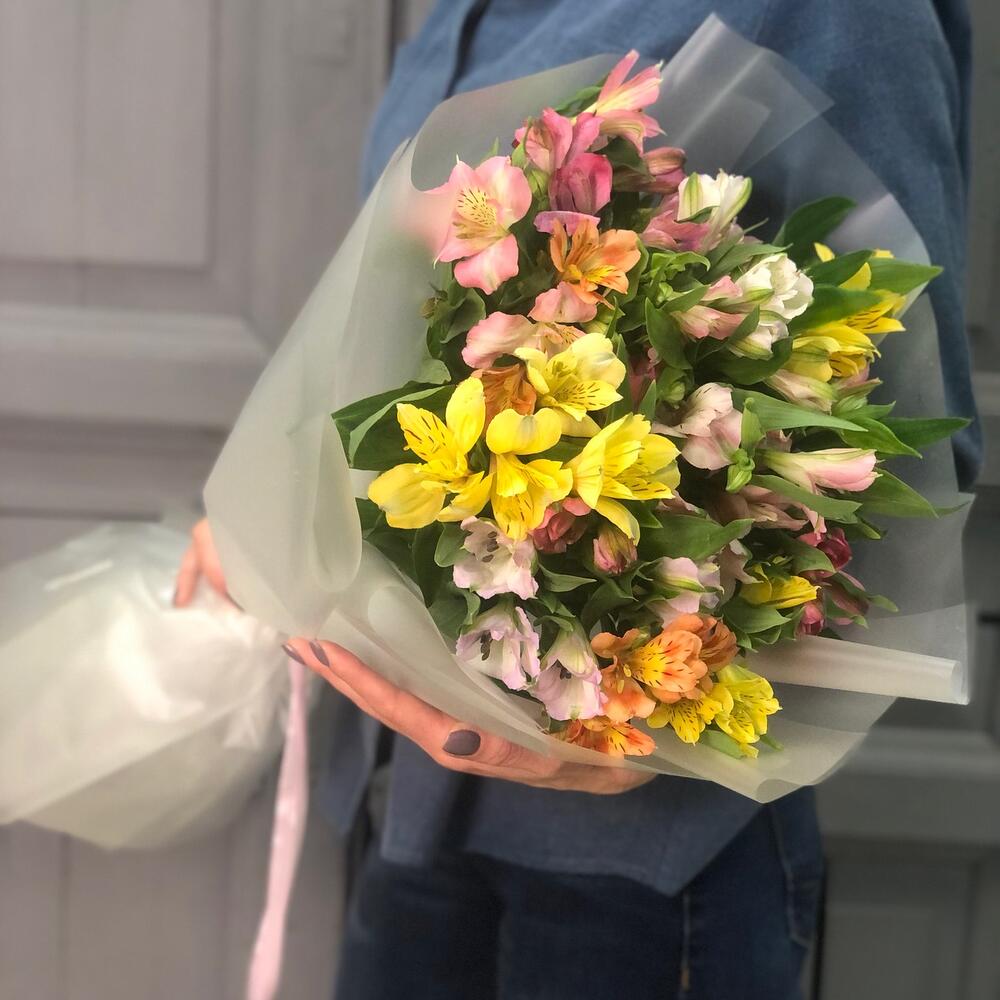 Альстромерия – 15 шт.Упаковка дизайнерская – 4 шт.Лента атласная – 2 шт.