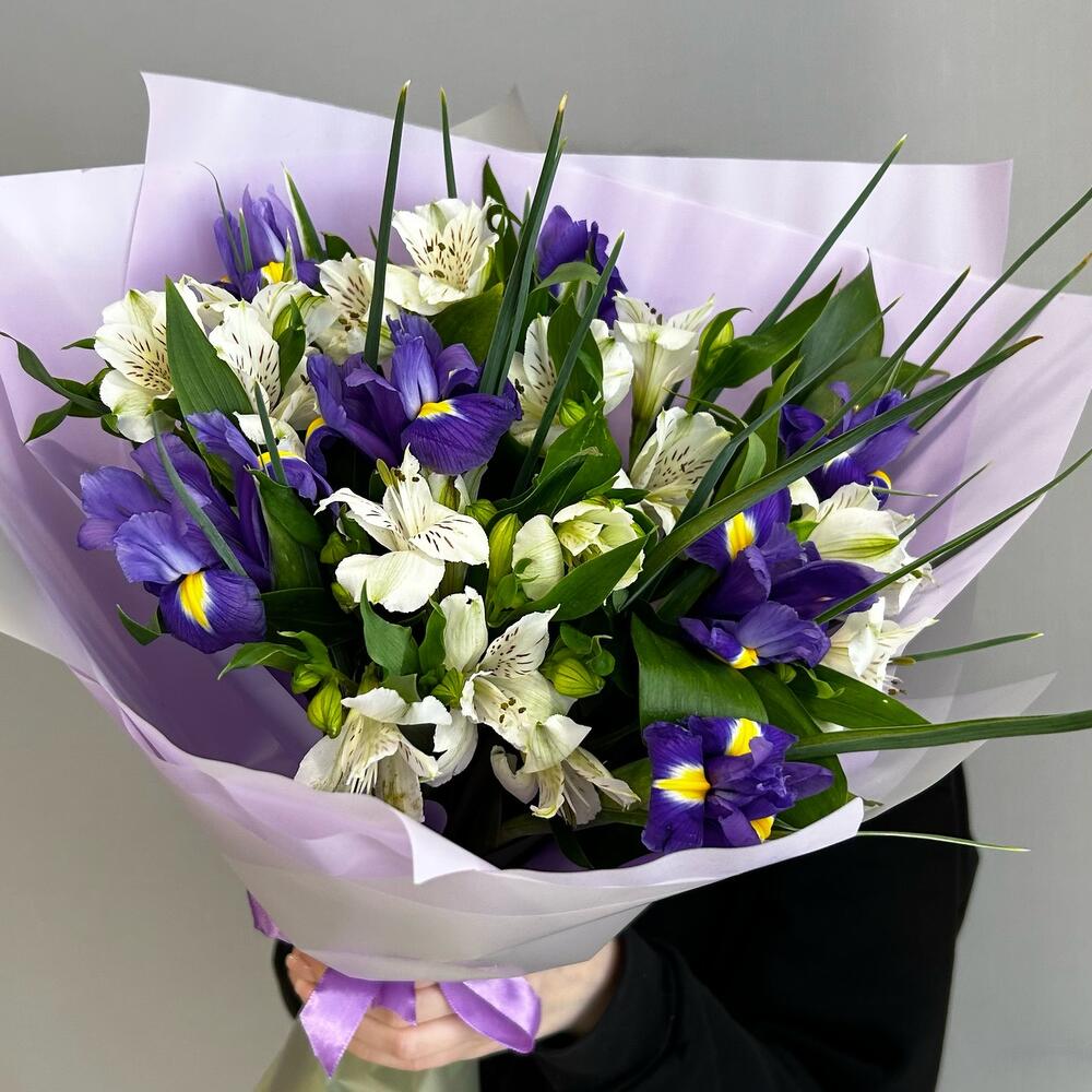 Альстромерия – 6 шт.Ирис – 7 шт.Зелень – 2 шт.Упаковка дизайнерская – 2 шт.Лента атласная – 2 шт.