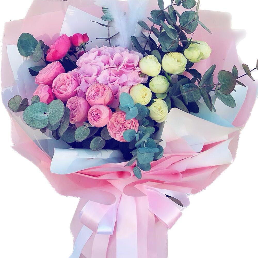 евкаліпт – 5 шт. троянда спрей піоні баблз – 3 шт. гортензія рожева – 1 шт. троянда сілва пінк екстра – 5 шт. пірʼя декоративне – 3 шт. фірмове оформлення букета – 1 шт. рідина для букета у вазу – 1 шт.