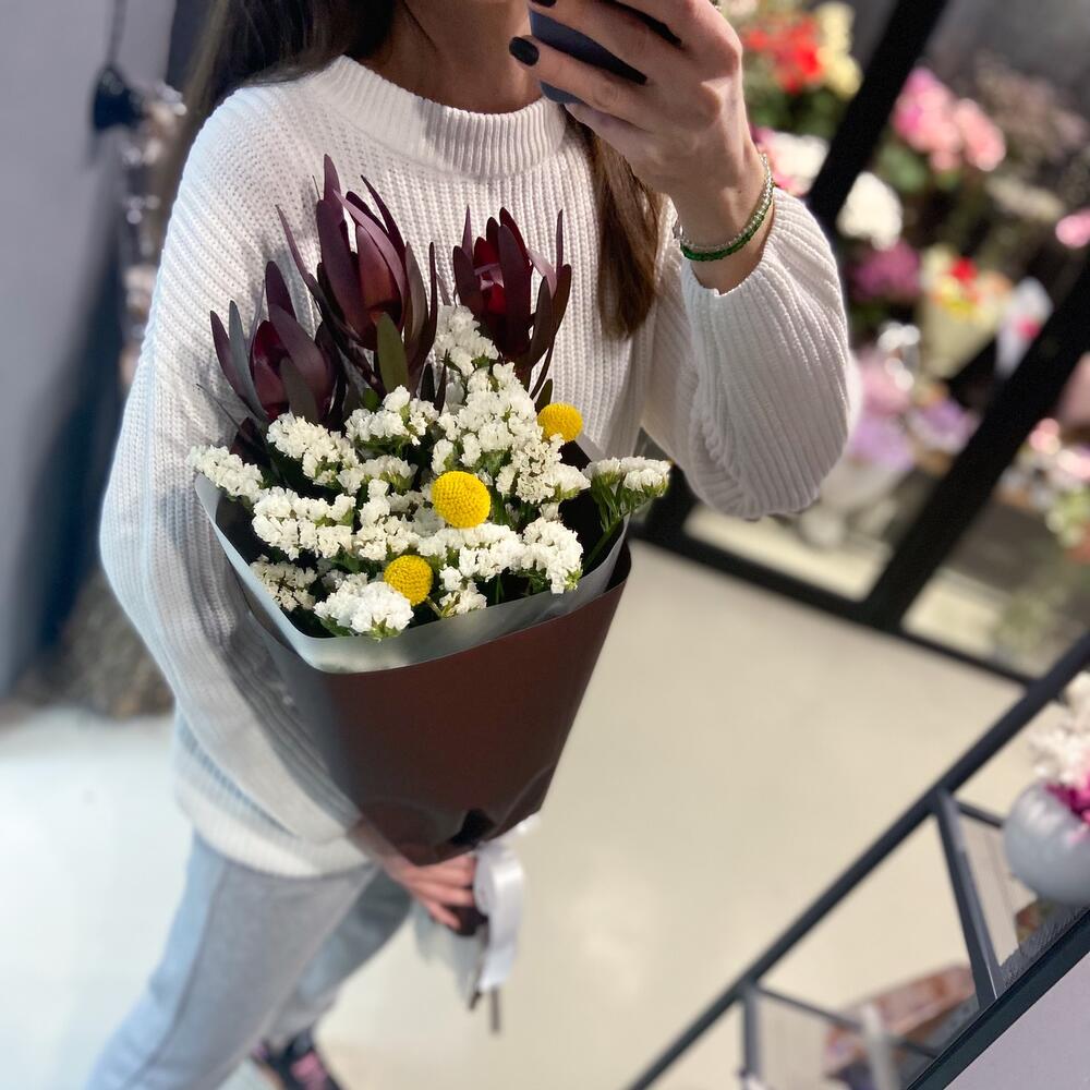 Упаковка – 1 шт.Статица белая – 3 шт.Краспедия желтая – 3 шт.Сафари бордовая – 3 шт.