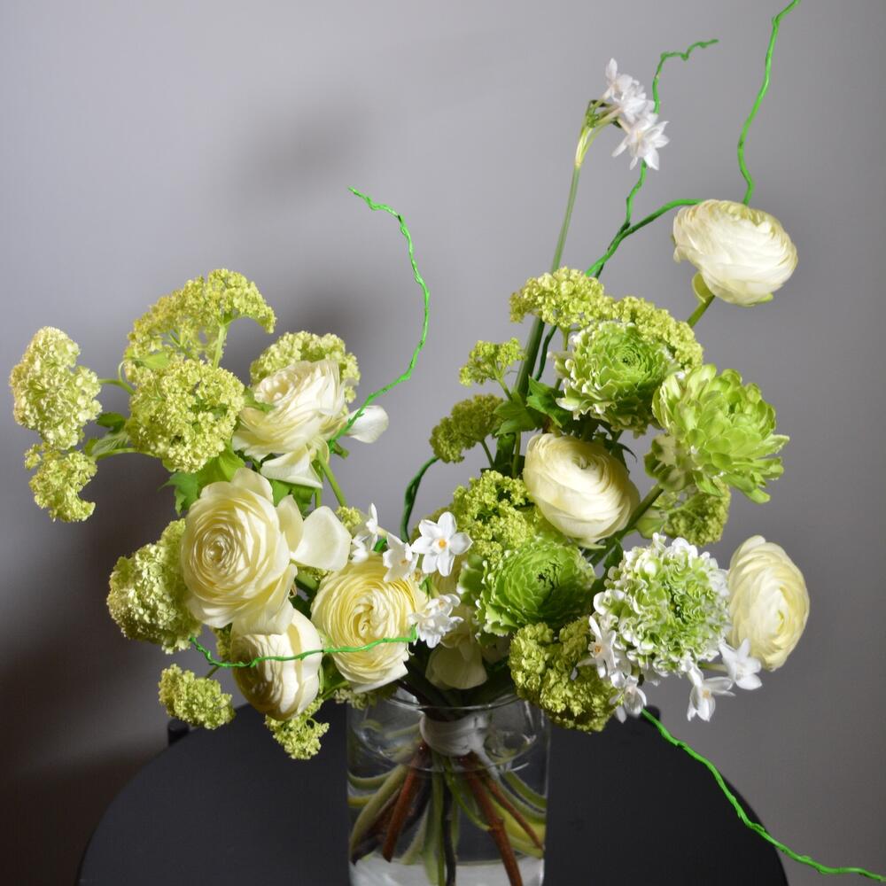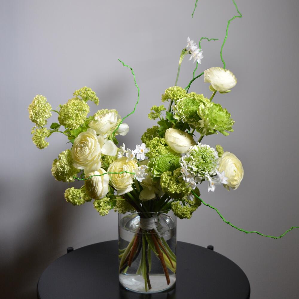 Ранункулюс – 10 шт.Вибурнум – 5 шт.Нарцисс – 5 шт.ветки декоративные – 3 шт.