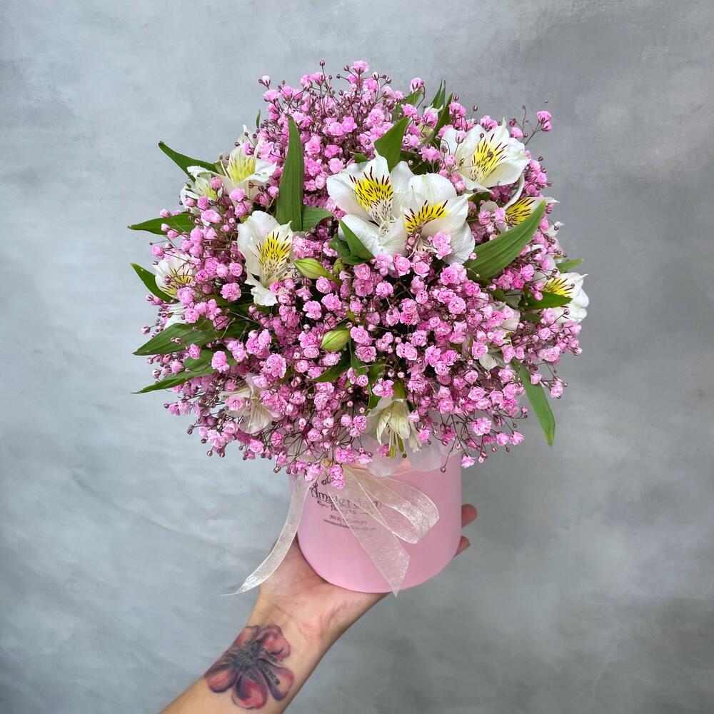 Альстромерия – 5 шт.Гипсофила розовая – 3 шт.Коробка d12 – 1 шт.Оазис – 1 шт.