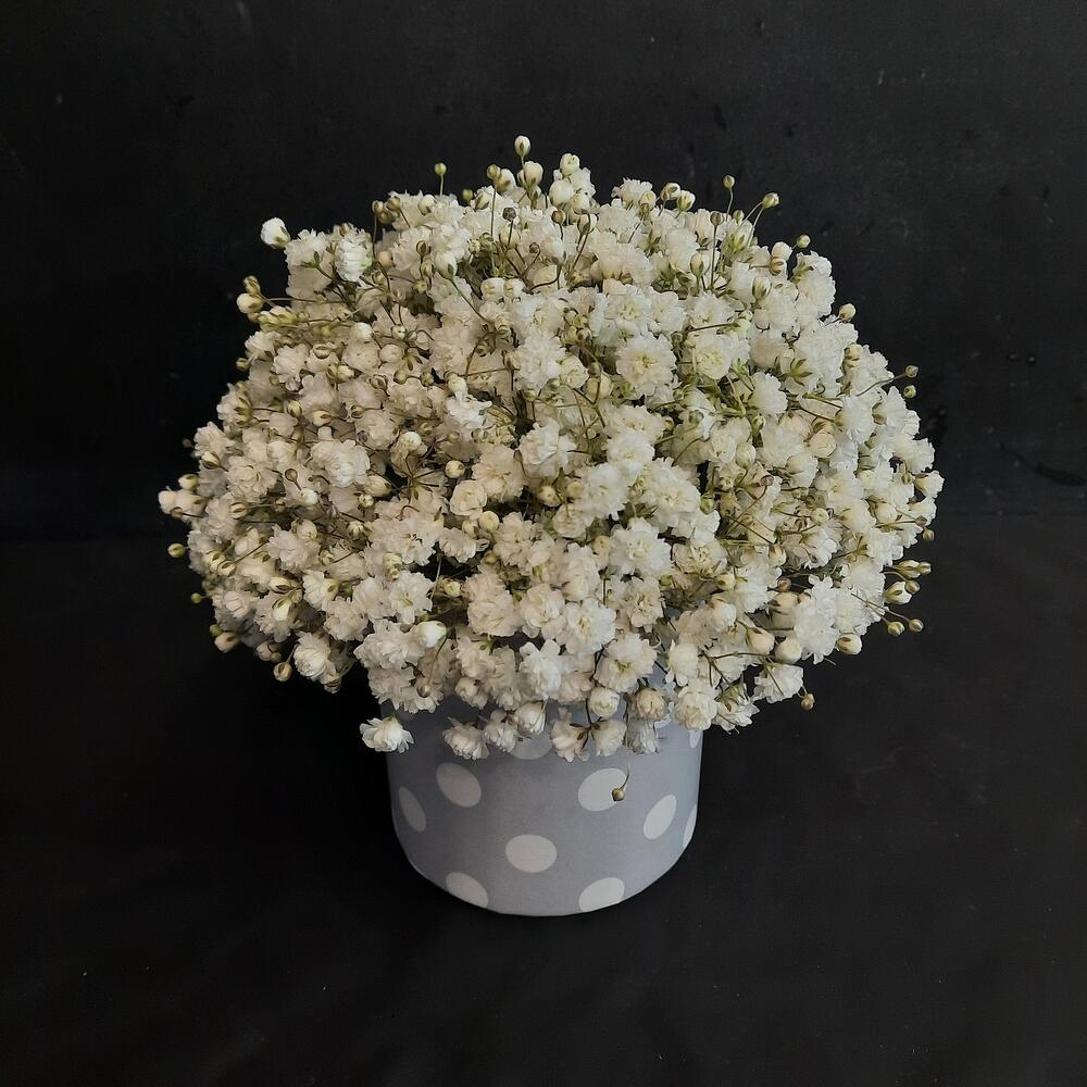 гипсофила белая – 3 шт.Коробка шляпная – 1 шт.Оазис флористический – 1 шт.