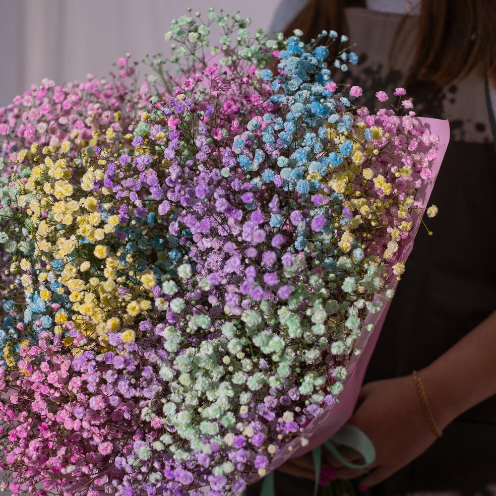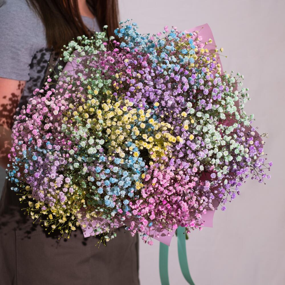 радужная гипсофила – 15 шт.Дизайнерская упаковка – 2 шт.Лента атласная – 1 шт.любовь флориста (бесплатно) – 1 шт.подкормка для срезанных цветов – 1 шт.инструкция по уходу за цветами – 1 шт.