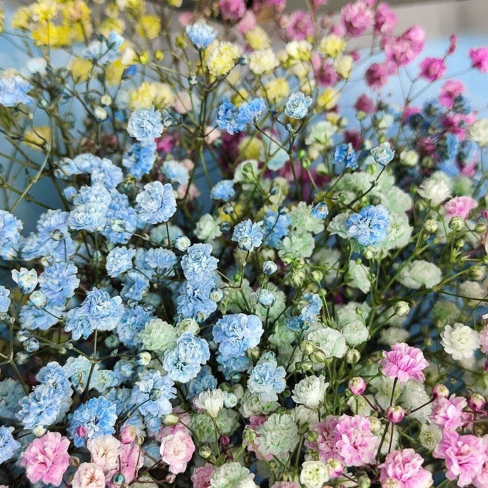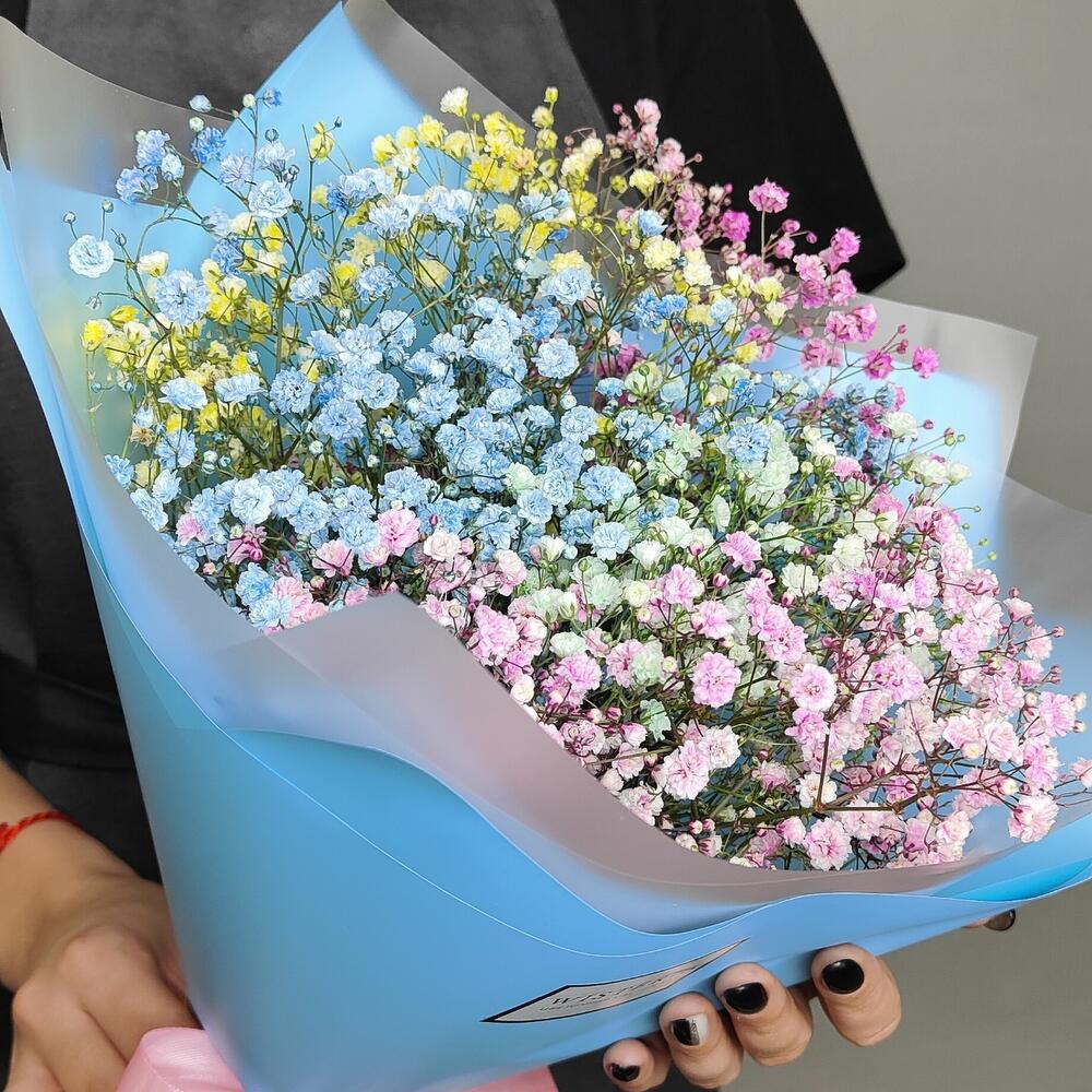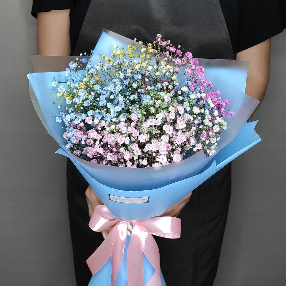 Лента атласная – 1 шт.Упаковка дизайнерская – 1 шт.гипсофила радужная – 5 шт.