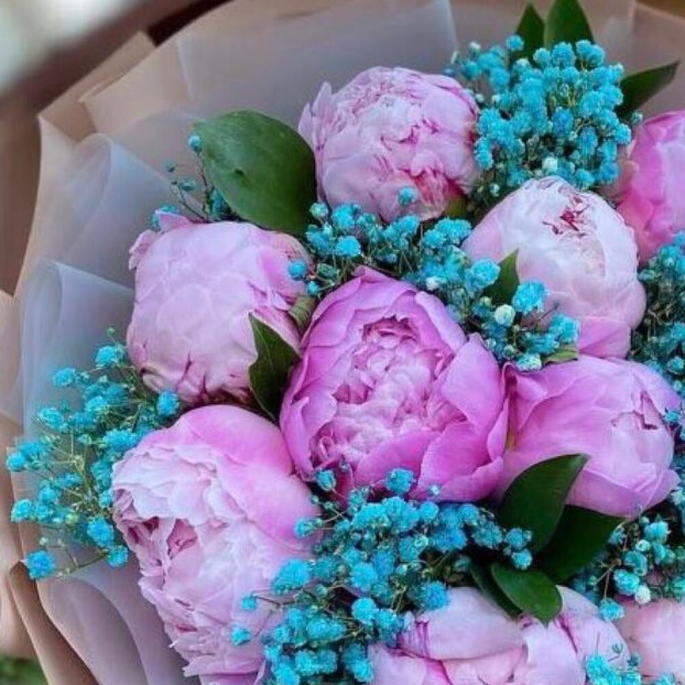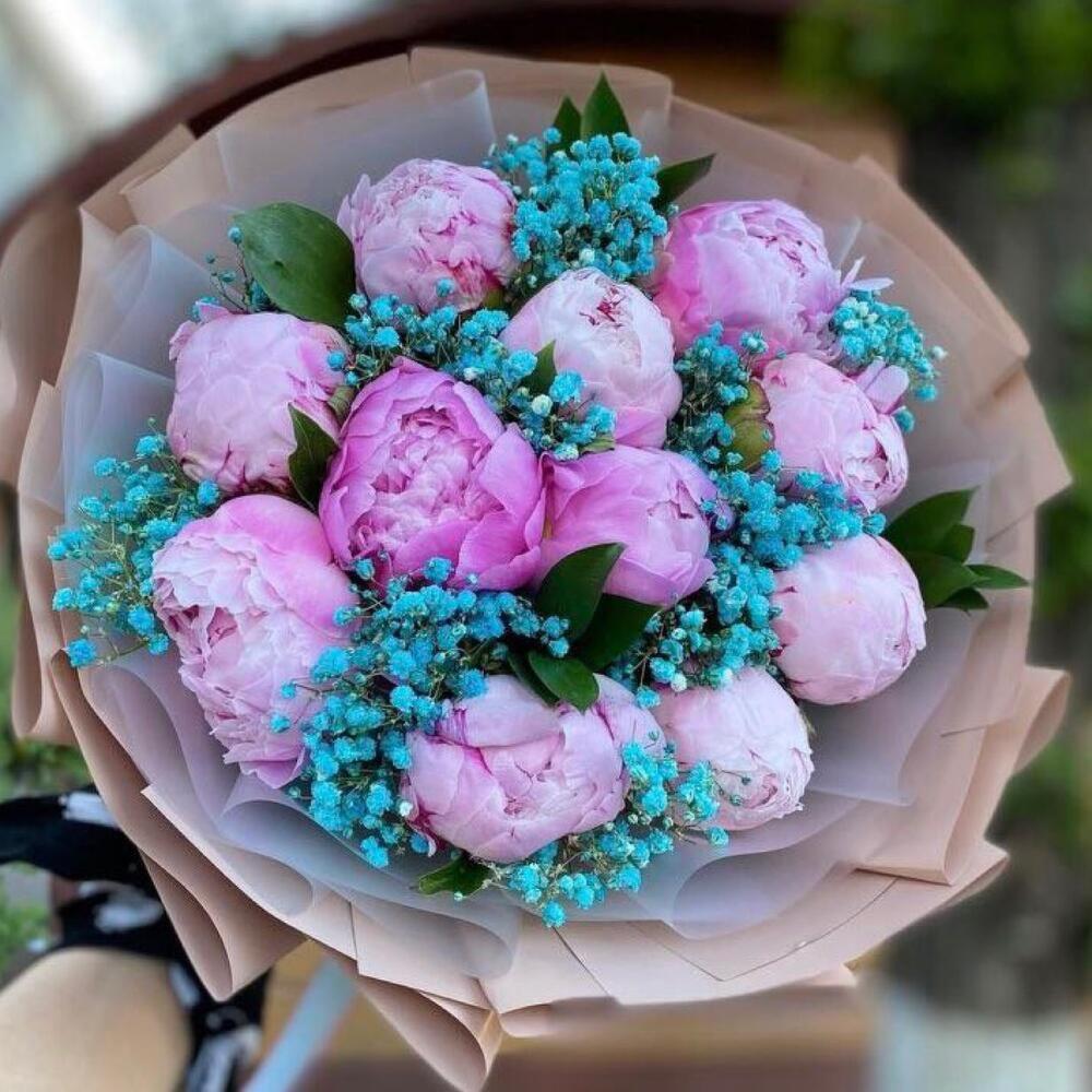 Пион розовый – 11 шт.Гипсофила голубая – 10 шт.Упаковка дизайнерская – 2 шт.Лента атласная – 2 шт.Открыточка с вашими пожеланиями – 1 шт.хорошее настроение – 100 шт.инструкция по уходу за цветами – 1 шт.коробка переноска – 1 шт.Кризал – 1 шт.