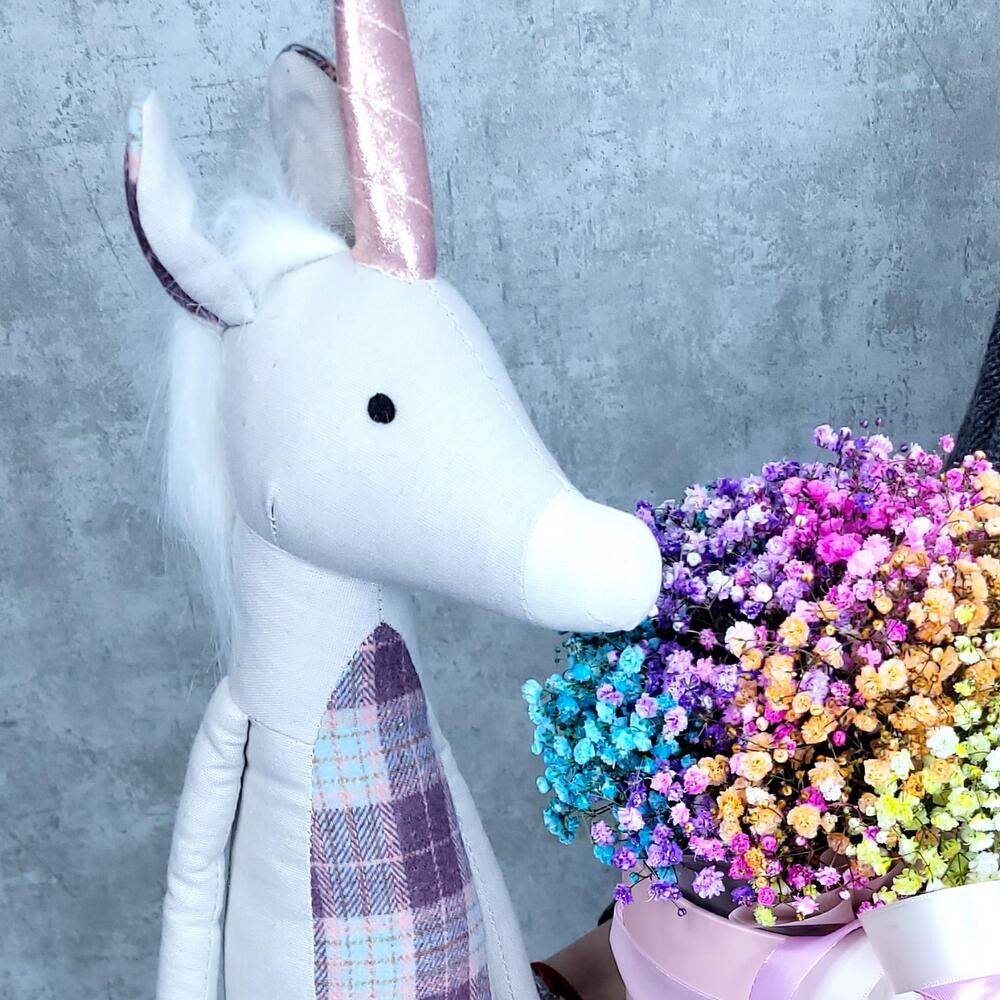 Гипсофила – 5 шт.Хлопок – 3 шт.Шляпная коробка – 1 шт.мишка единорог – 1 шт.