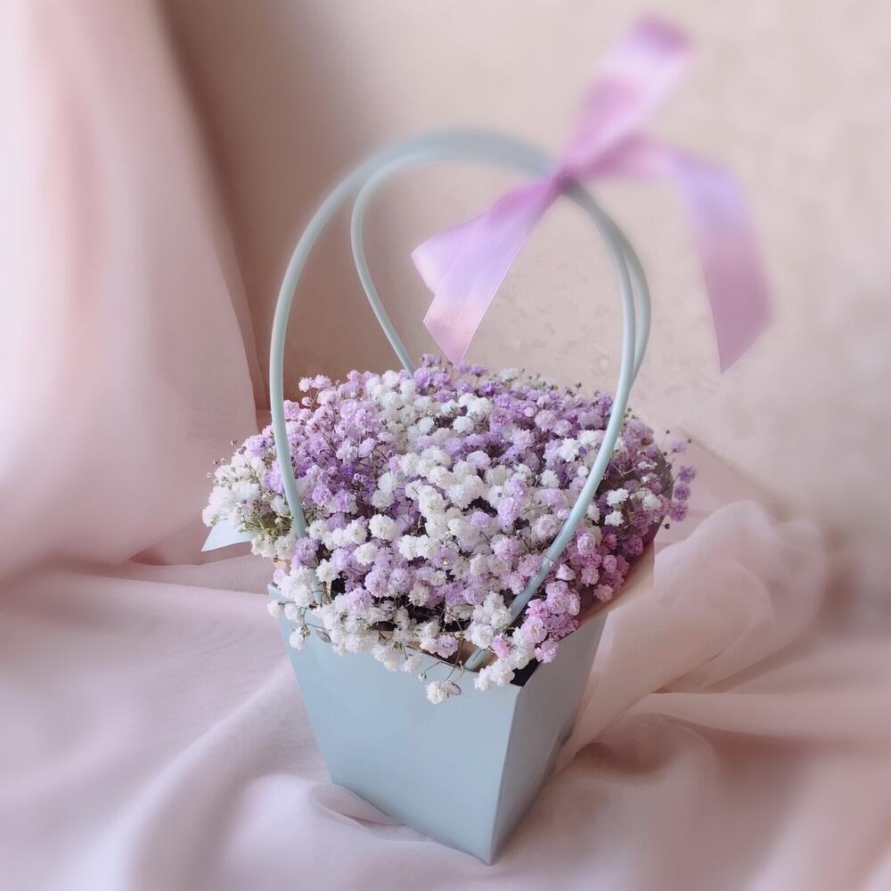 Лента атласная – 1 шт.Сумочка – 1 шт.Флористическая губка – 1 шт.Гипсофила фиолетовая – 3 шт.гипсофила белая – 2 шт.