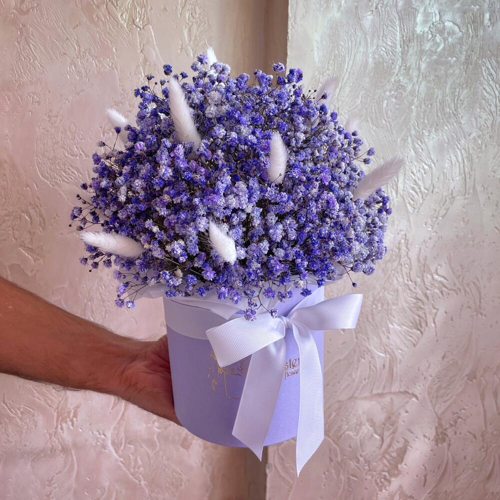 Гипсофила – 7 шт. Лагурус – 11 шт. Оазис флористический – 1 шт. Лента репсовая – 1 шт. коробка шляпная d15 – 1 шт.