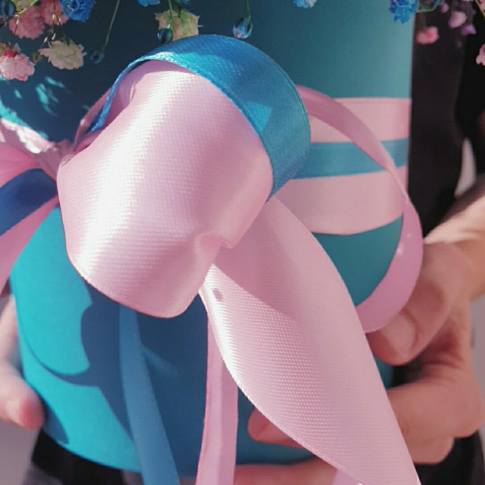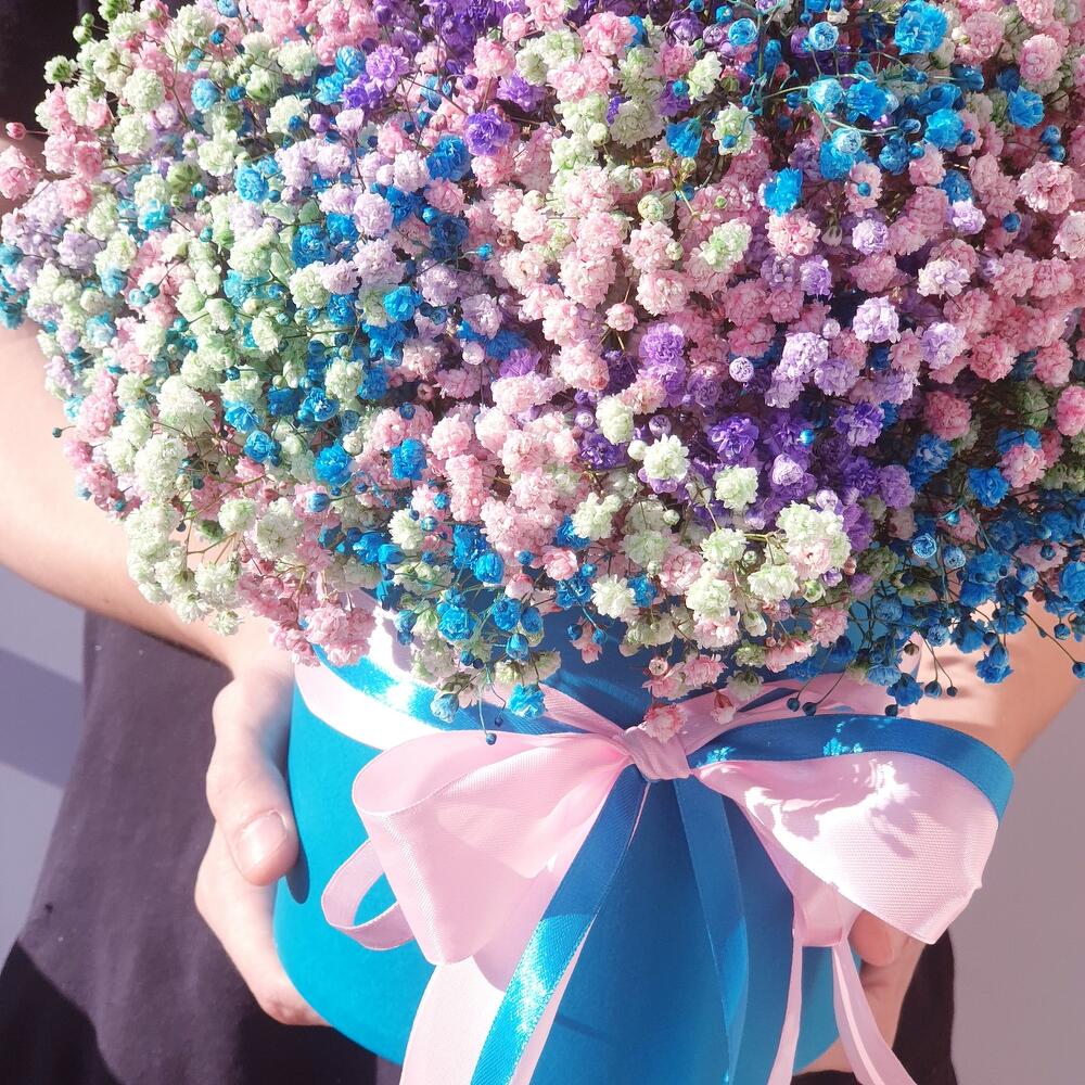 Лента атласная – 2 шт.Оазис флористический – 1 шт.гипсофила радужная – 11 шт.любовь флориста (бесплатно) – 1 шт.коробка шляпная большая изумрудная – 1 шт.
