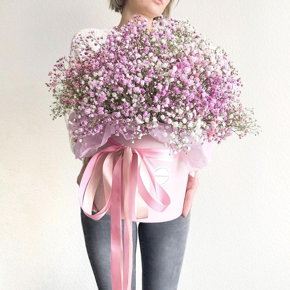 “Сиреневый туман” – композиция из гипсофилы в шляпной коробке