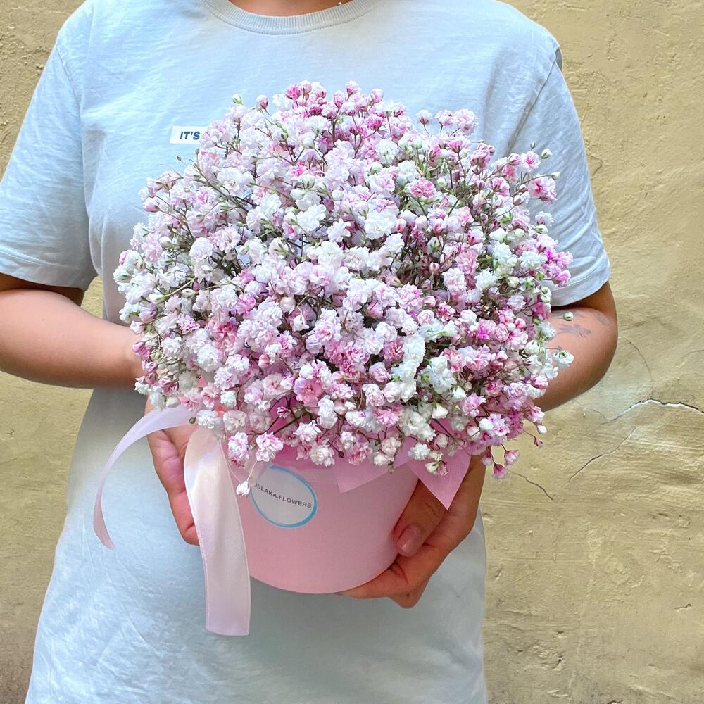 Гипсофила – 5 шт.Коробка шляпная – 1 шт.Лента атласная – 1 шт.Губка флористическая – 1 шт.