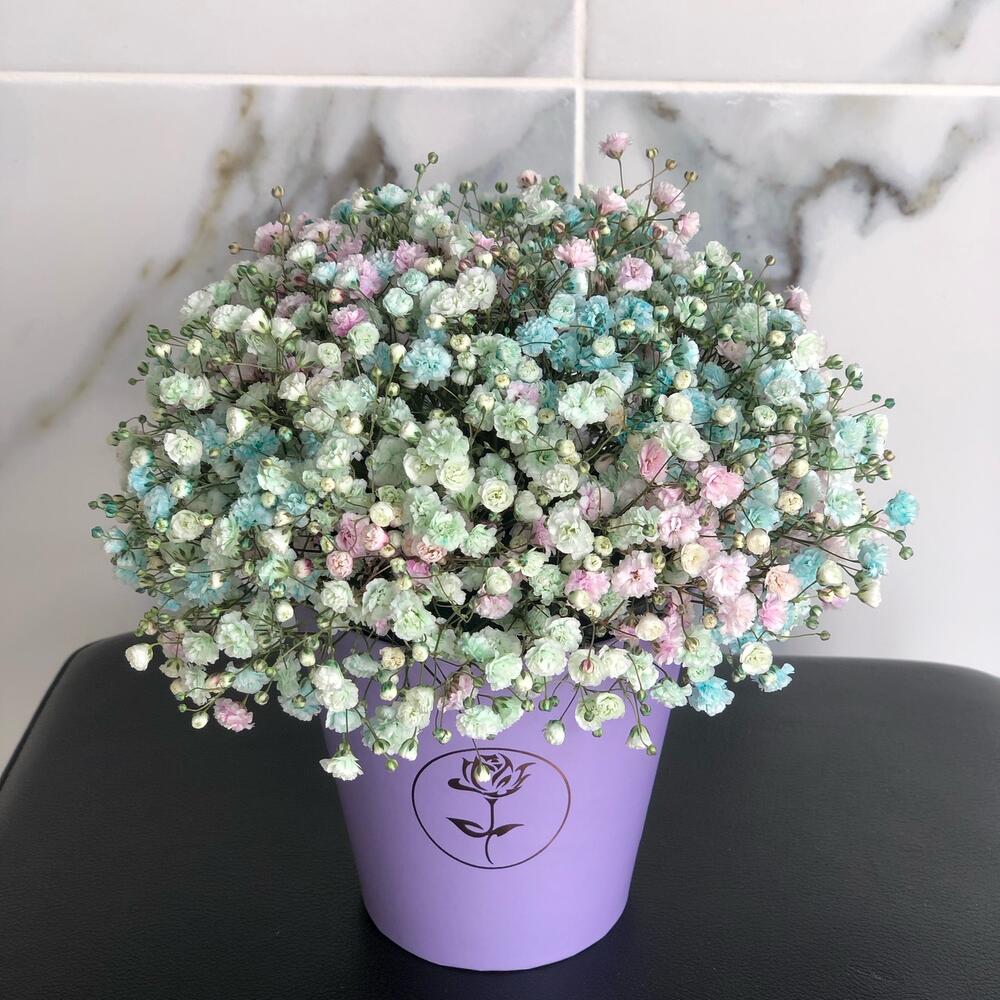 “Сиреневый туман” – композиция из гипсофилы в шляпной коробке