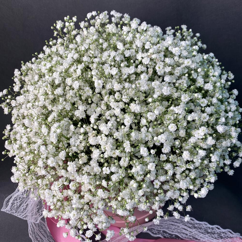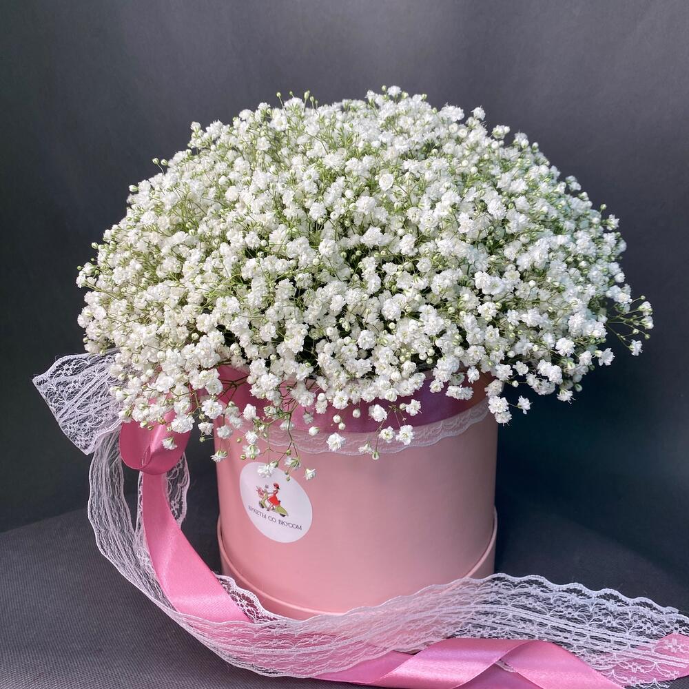 Шляпная коробка с лентами – 1 шт.Губка флористическая – 1 шт.гипсофила белая – 5 шт.