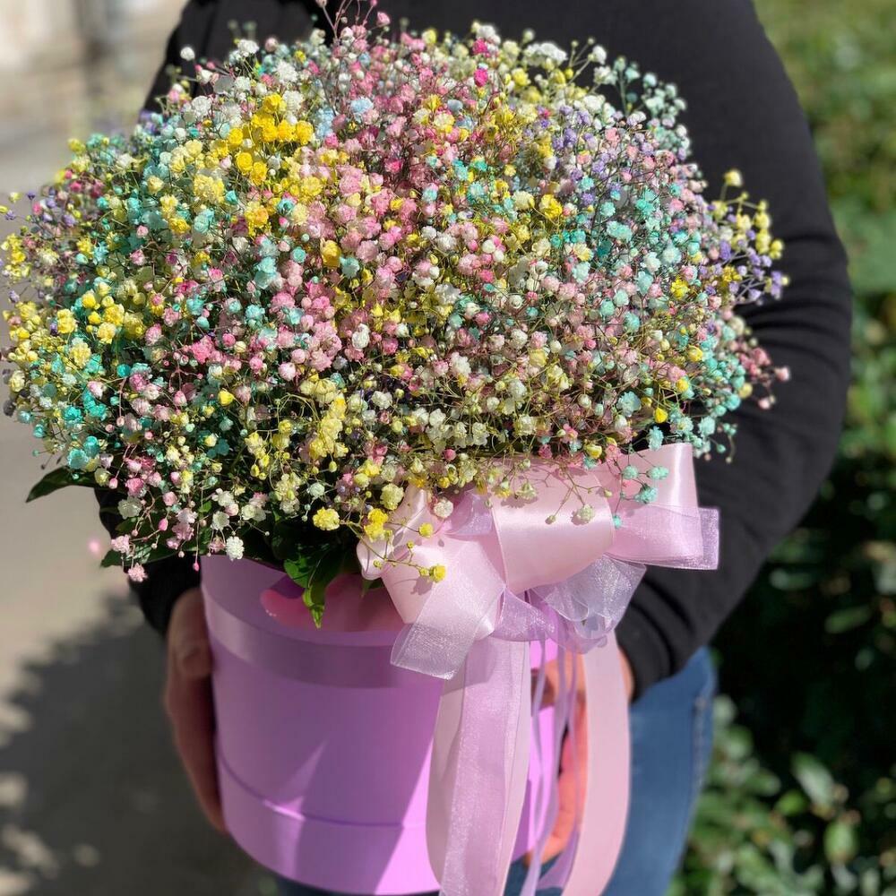 “Сиреневый туман” – композиция из гипсофилы в шляпной коробке