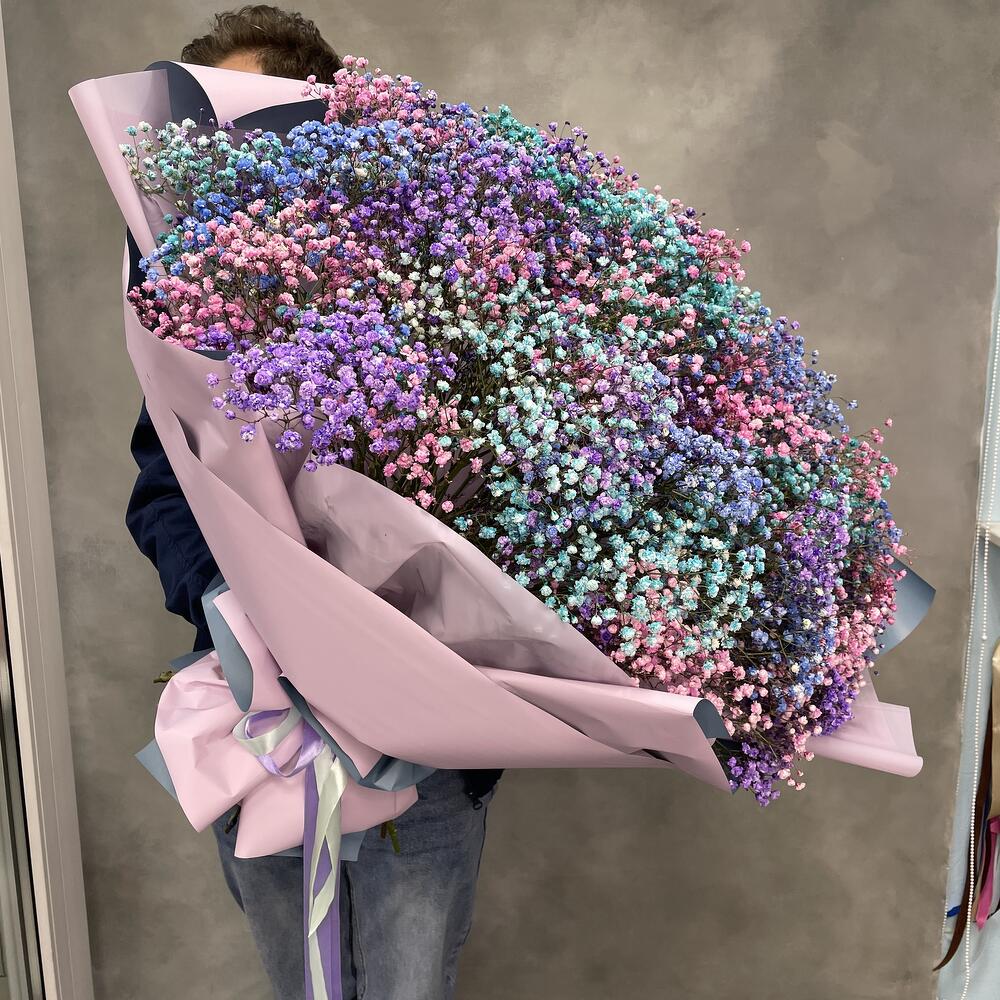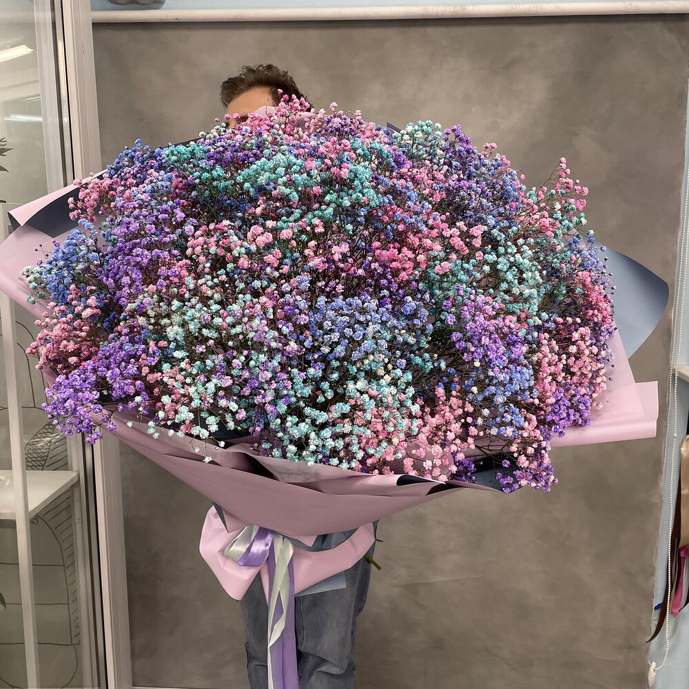 Огромная охапка цветной гипсофилы вскружит голову и навсегда запомнится вашей любимой. Невероятные впечатления обеспечены.
