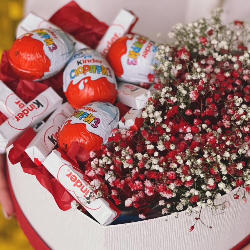 Гипсофила – 5 шт.Шляпная коробка – 1 шт.Киндер шоколад – 10 шт.Киндер сюрприз яйцо – 4 шт.