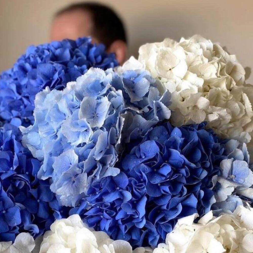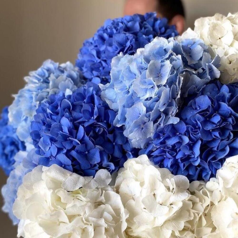 Гортензия белая – 4 шт.Гортензия голубая – 4 шт.Гортензия синяя – 5 шт.Лента атласная – 2 шт.Открыточка с вашими пожеланиями – 1 шт.хорошее настроение – 100 шт.инструкция по уходу за цветами – 1 шт.коробка переноска – 1 шт.Кризал – 1 шт.