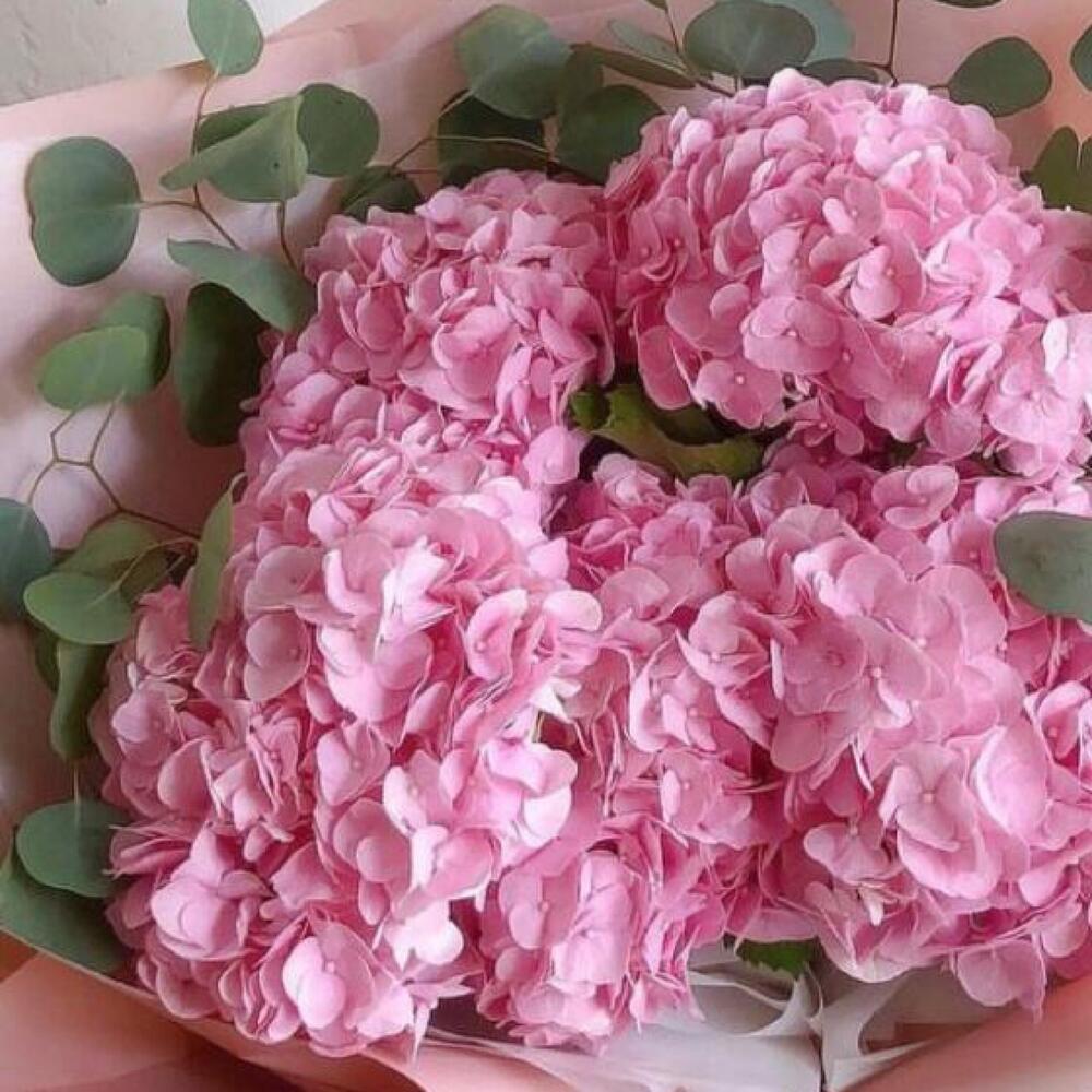 Букет из 5 розовых гортензий с эвкалиптом