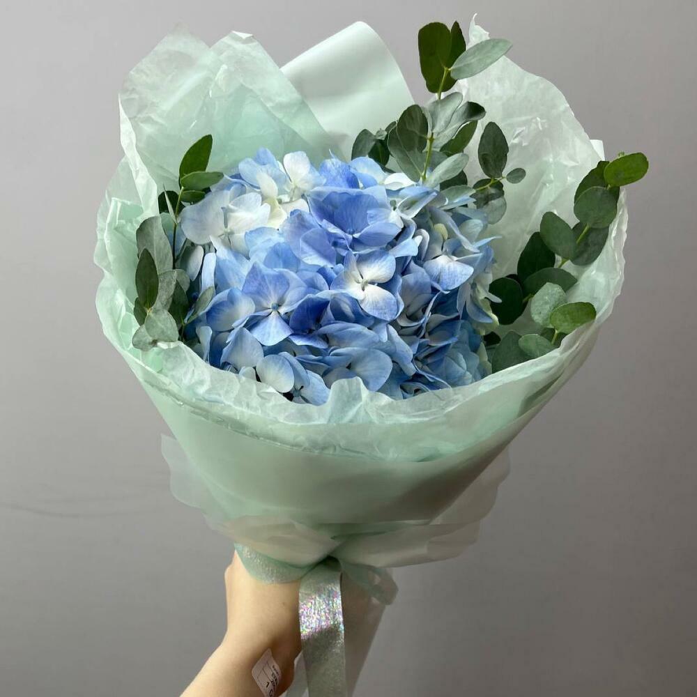 Миниатюрный букет из небесно-голубой гортензии, обрамленной веточками эвкалипта, в дизайнерской упаковке