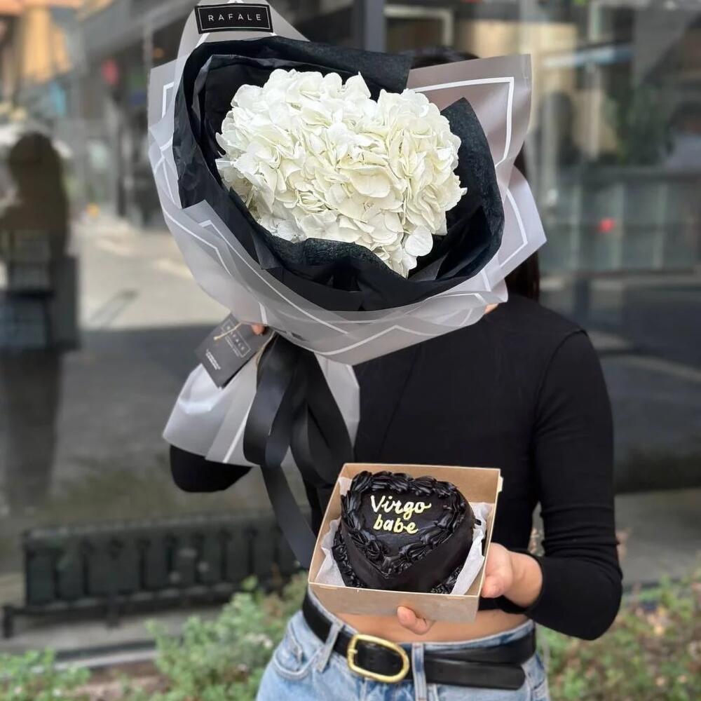 Нежный букет из гортензий с бенто-тортом.