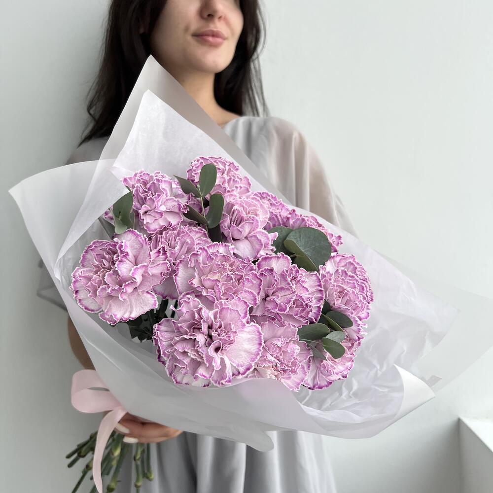 15 фиолетовых гвоздик с эвкалиптом (букет N 30)