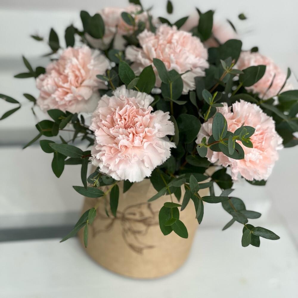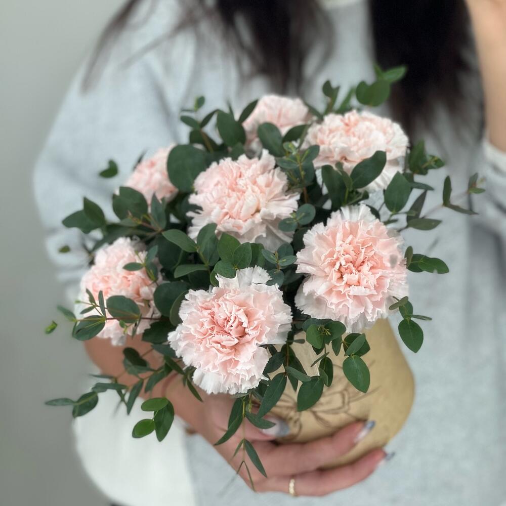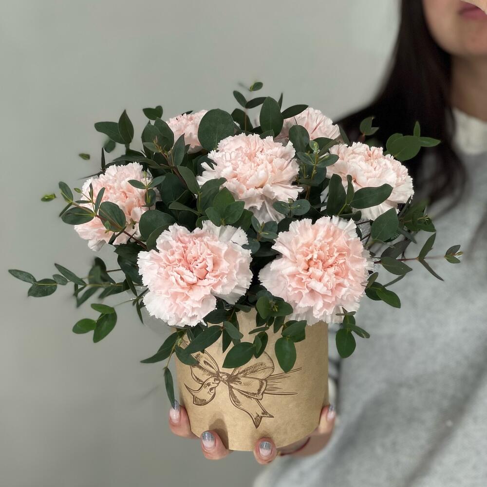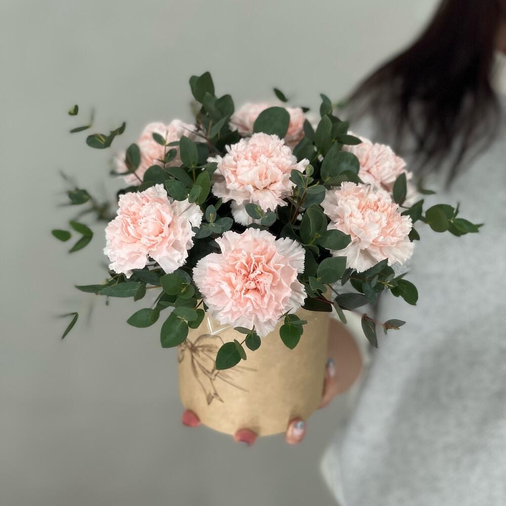 Эвкалипт – 2 шт.коробочка с оазисом – 1 шт.гвоздика кремовая диантус – 7 шт.