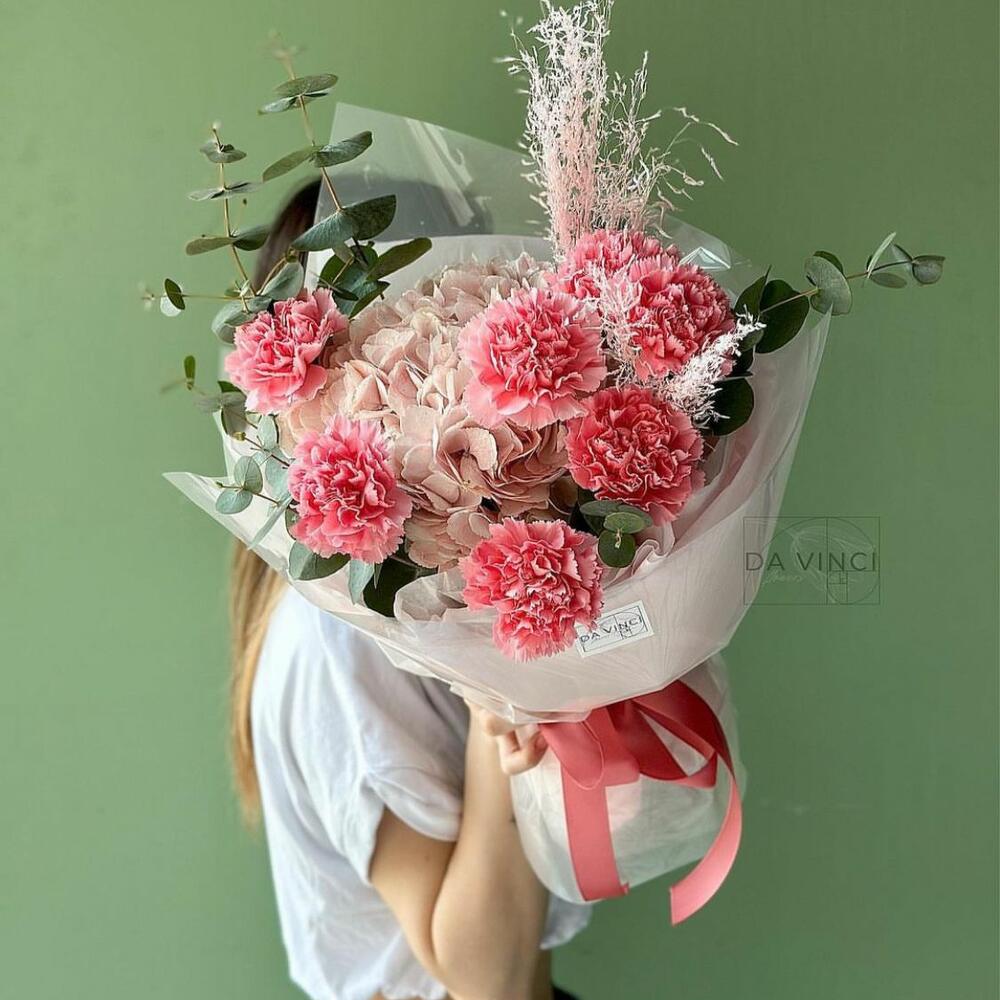 Композиция "Амаретти" с гортензией и гвоздикой в стильном оформлении. – Выбрав букет от DaVinci Flowers Вы скрасите день обладательницы букета и подарите ей незабываемые эмоции.
