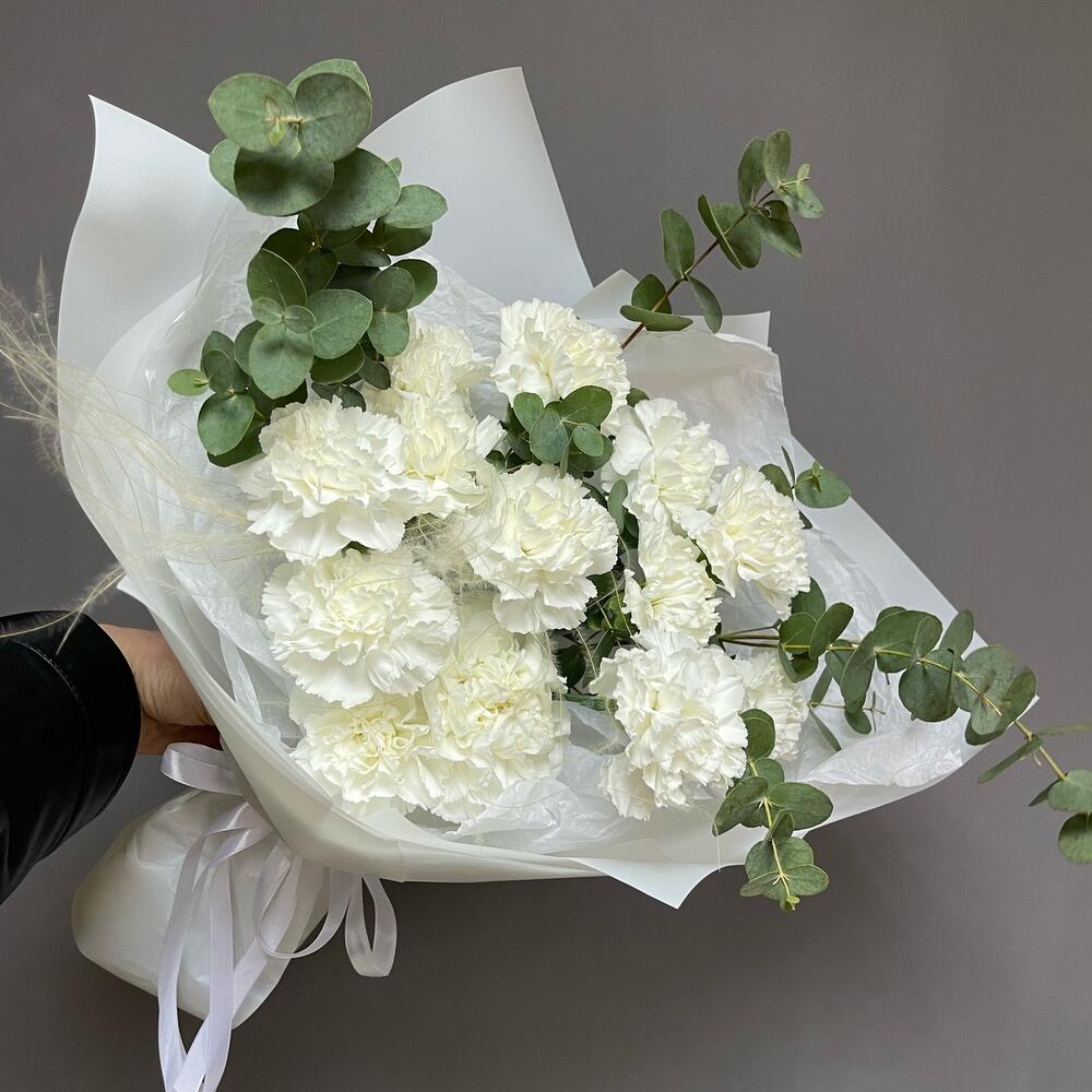 Букет из белых гвоздик и эвкалипт