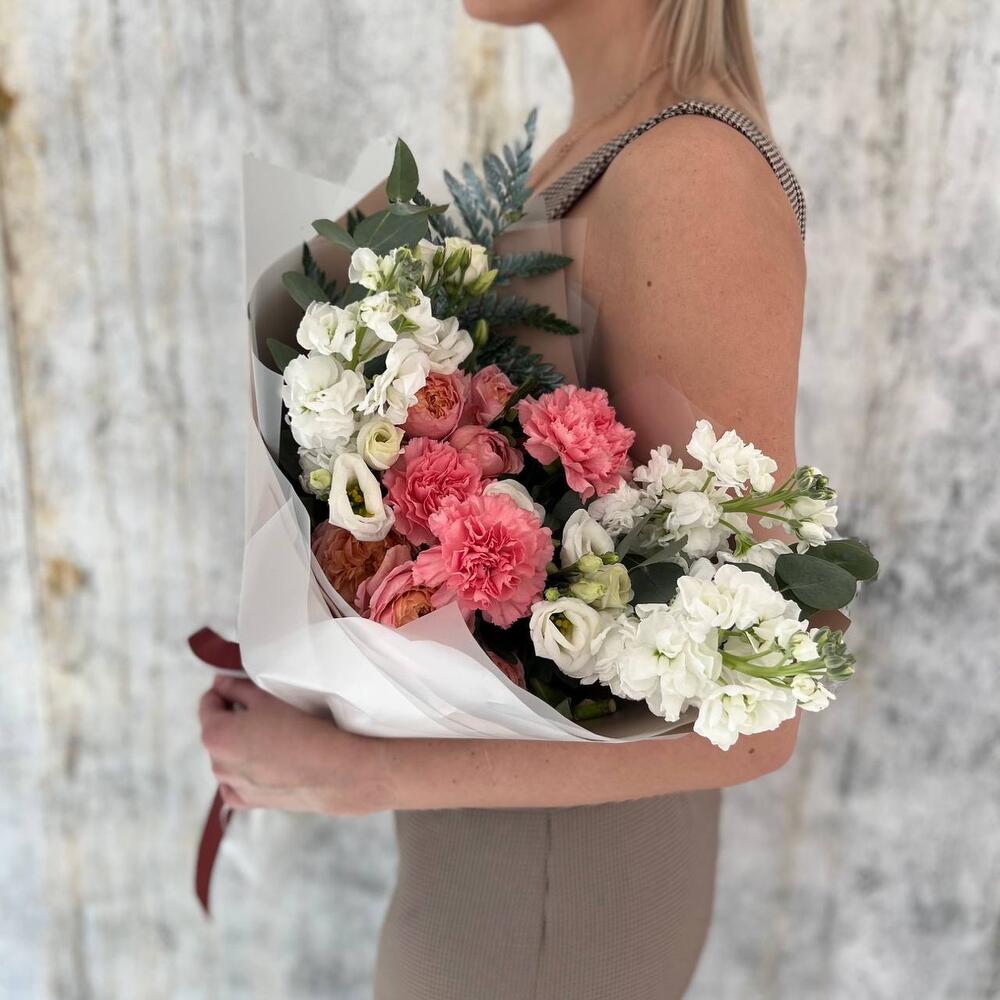 Маттиола – 3 шт.Папоротник – 1 шт.Эвкалипт – 2 шт.Диантус – 3 шт.Фисташка – 5 шт.Упаковка дизайнерская – 3 шт.эустома белая – 2 шт.пионовидные кустовые розы – 2 шт.