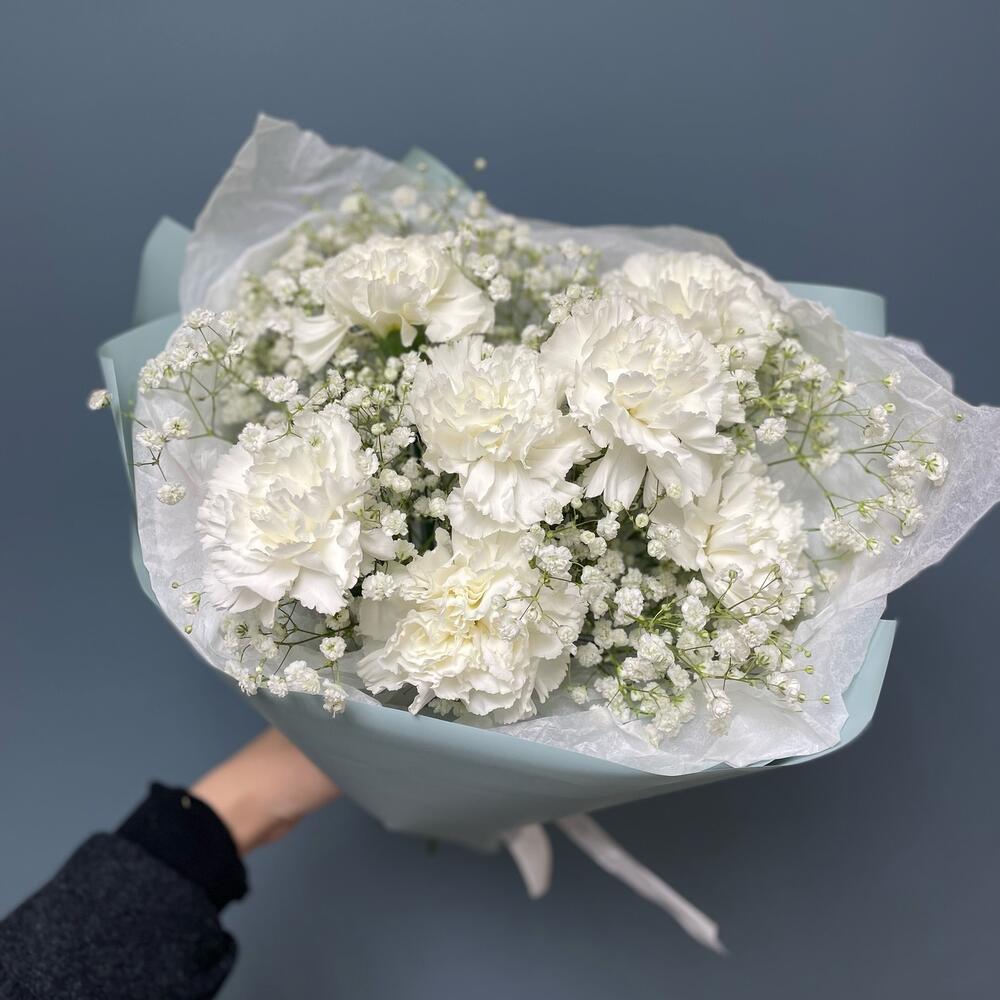 Диантус – 7 шт.Гипсофила – 3 шт.Упаковка – 1 шт.Тишью – 2 шт.Лента атласная – 1 шт.
