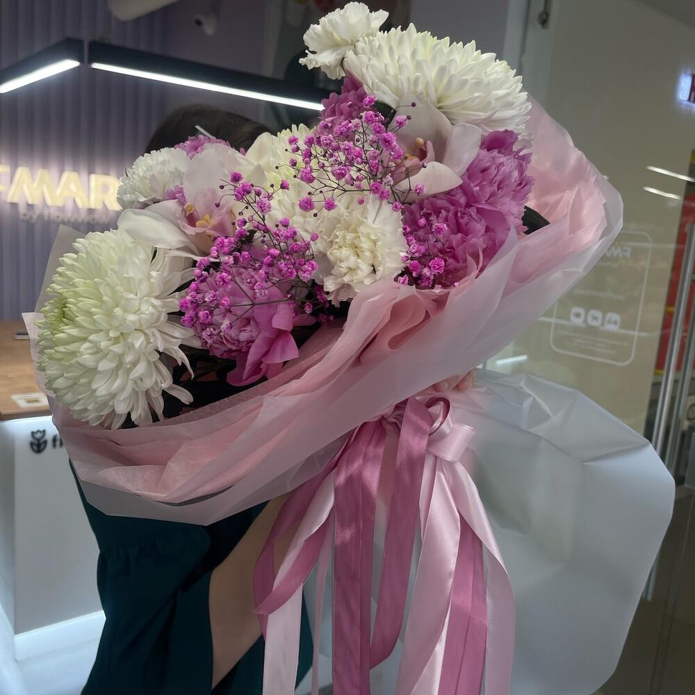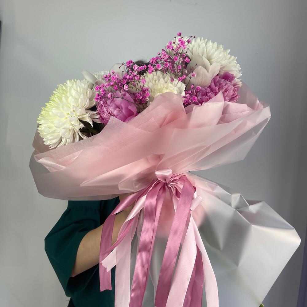 Гипсофила – 1 шт.Орхидея Цимбидиум – 3 шт.Пион – 6 шт.Хризантема – 5 шт.Тишью – 4 шт.Фисташка – 3 шт.Пленка матовая – 6 шт.Диантус сортовой – 3 шт.
