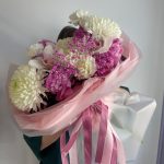 Букет с пионами и хризантемой в дизайнерском оформлении