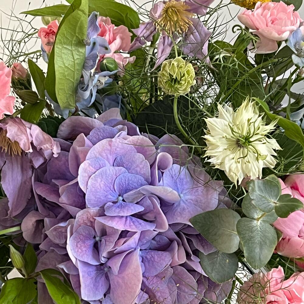 Гортензия – 1 шт.Дельфиниум – 3 шт.Гвоздика кустовая – 5 шт.Пион Сара Бернар – 3 шт.Клематис лиловый – 5 шт.зелень декоративная – 5 шт.