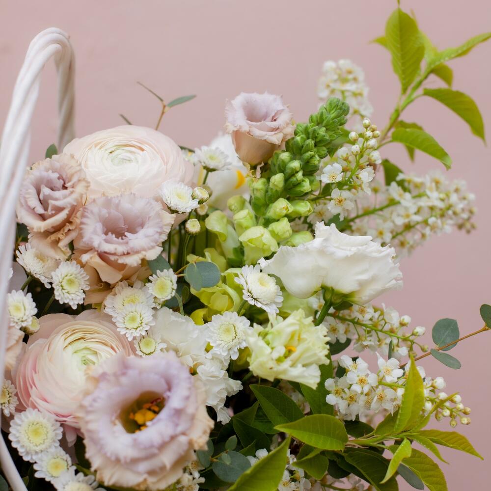 Корзина плетеная – 1 шт.Ранункулюс (белый) – 3 шт.Хризантема кустовая – 3 шт.Ирис – 2 шт.Лизиантус – 4 шт.Диантус – 4 шт.Антуриум – 4 шт.
