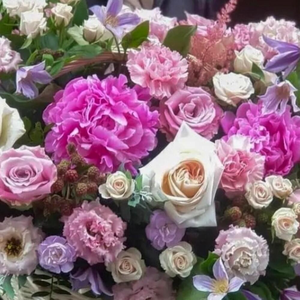 Корзина с пионами,пионовидными розами, гвоздиками и клематисом