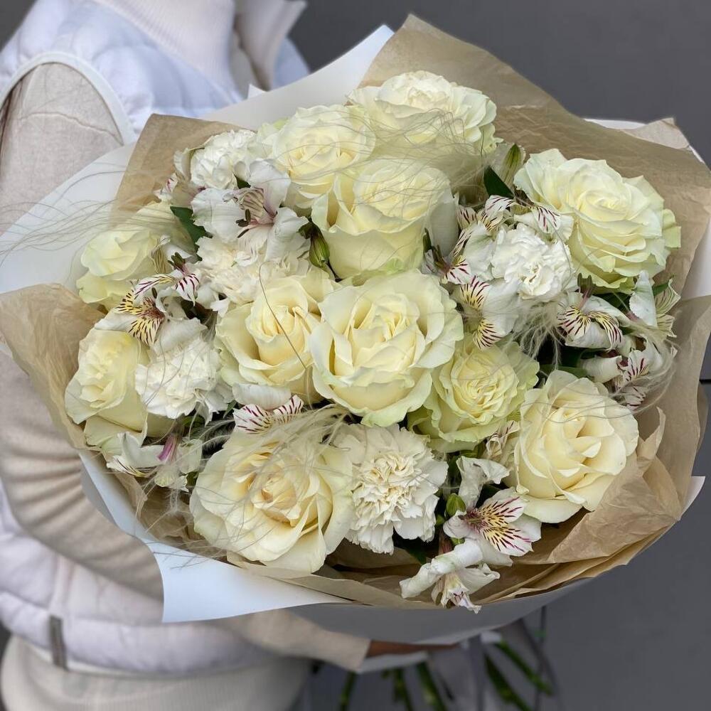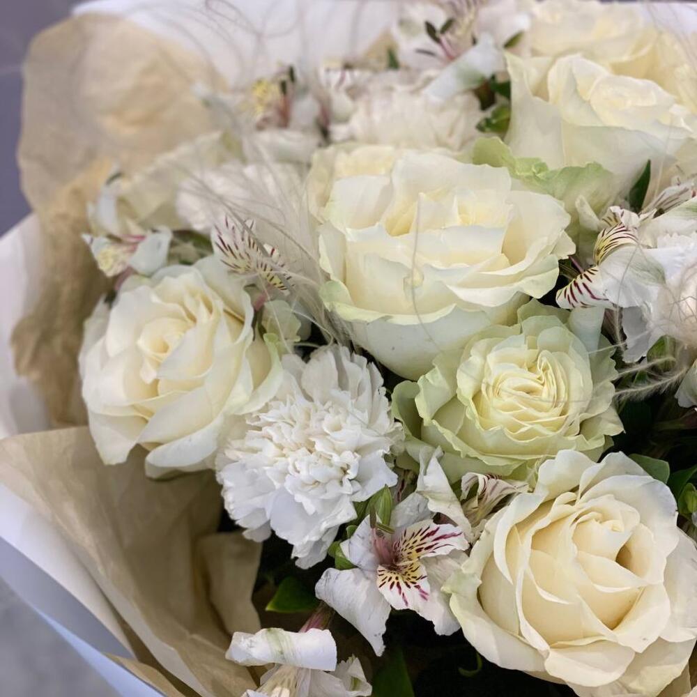 Нежный букет из белой розы с декоративной стифой