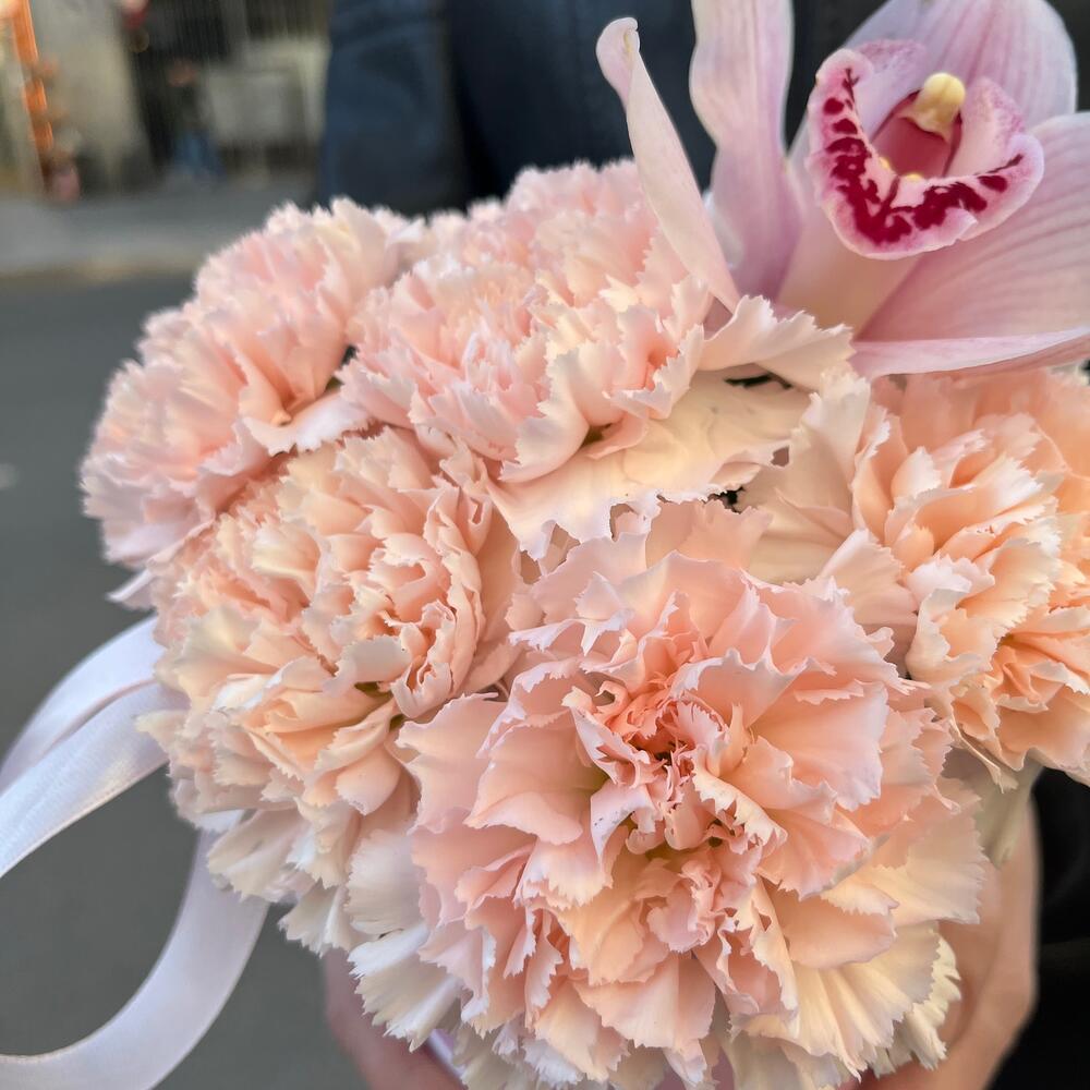 Орхидея Цимбидиум белая – 1 шт.Диантус кремовый – 7 шт.Оазис флористический – 1 шт.удлинитель для орхидеи – 1 шт.Лента атласная нежно-розовая – 1 шт.шляпная коробочка мини – 1 шт.