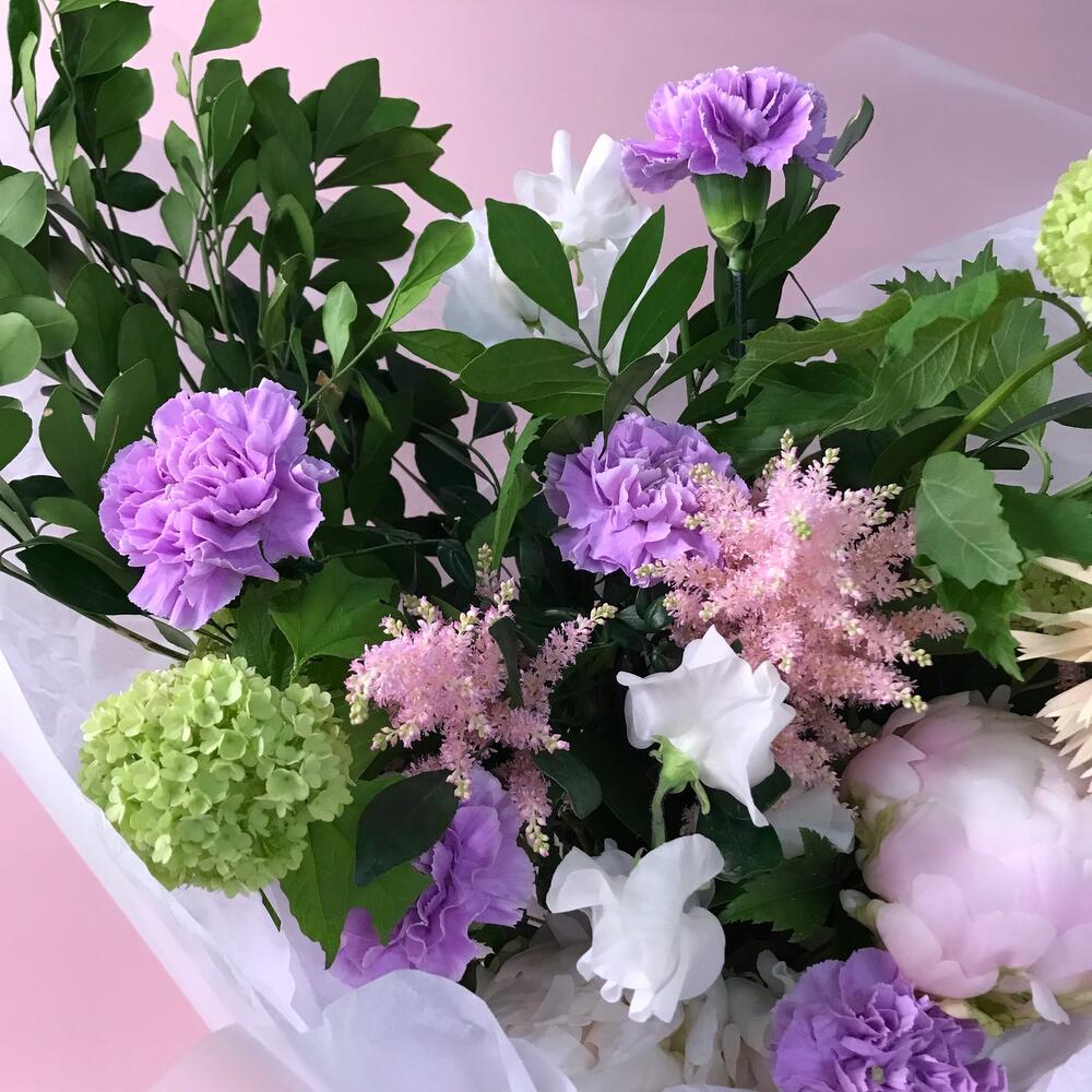 Оформление – 1 шт.Тишью – 3 шт.Пион Италия – 2 шт.Латирус – 2 шт.Диантус мун аква – 5 шт.Рускус Италия – 5 шт.Вибурнум – 2 шт.гербера томагавк – 1 шт.Астильба Европа – 3 шт.