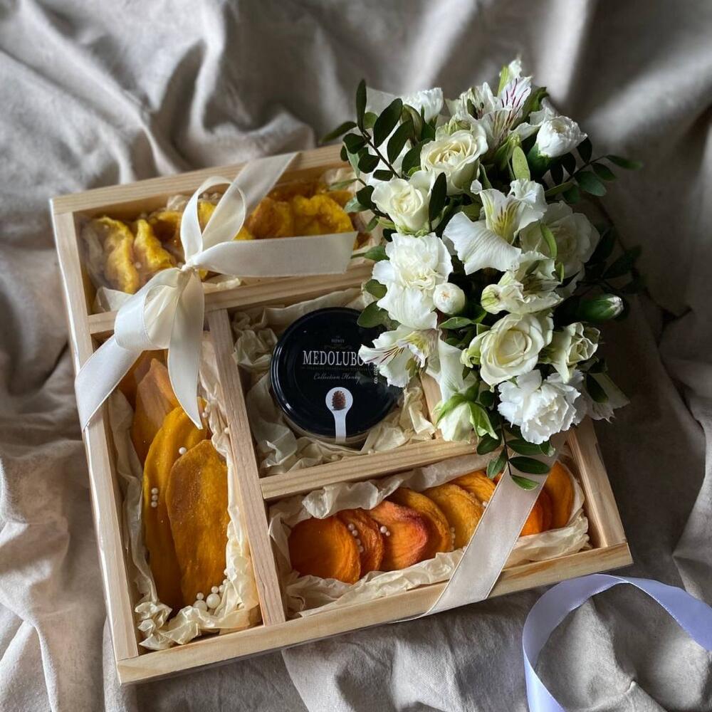 манго натуральное сушеное – 120 гр.персик натуральный вяленый – 120 шт.ананас натуральный сушеный – 120 шт.Роза кустовая – 1 шт.Гвоздика кустовая – 2 шт.Альстромерия – 2 шт.зелень фисташки – 1 шт.Подарочная коробка – 1 шт.крем-мëд – 1 шт.